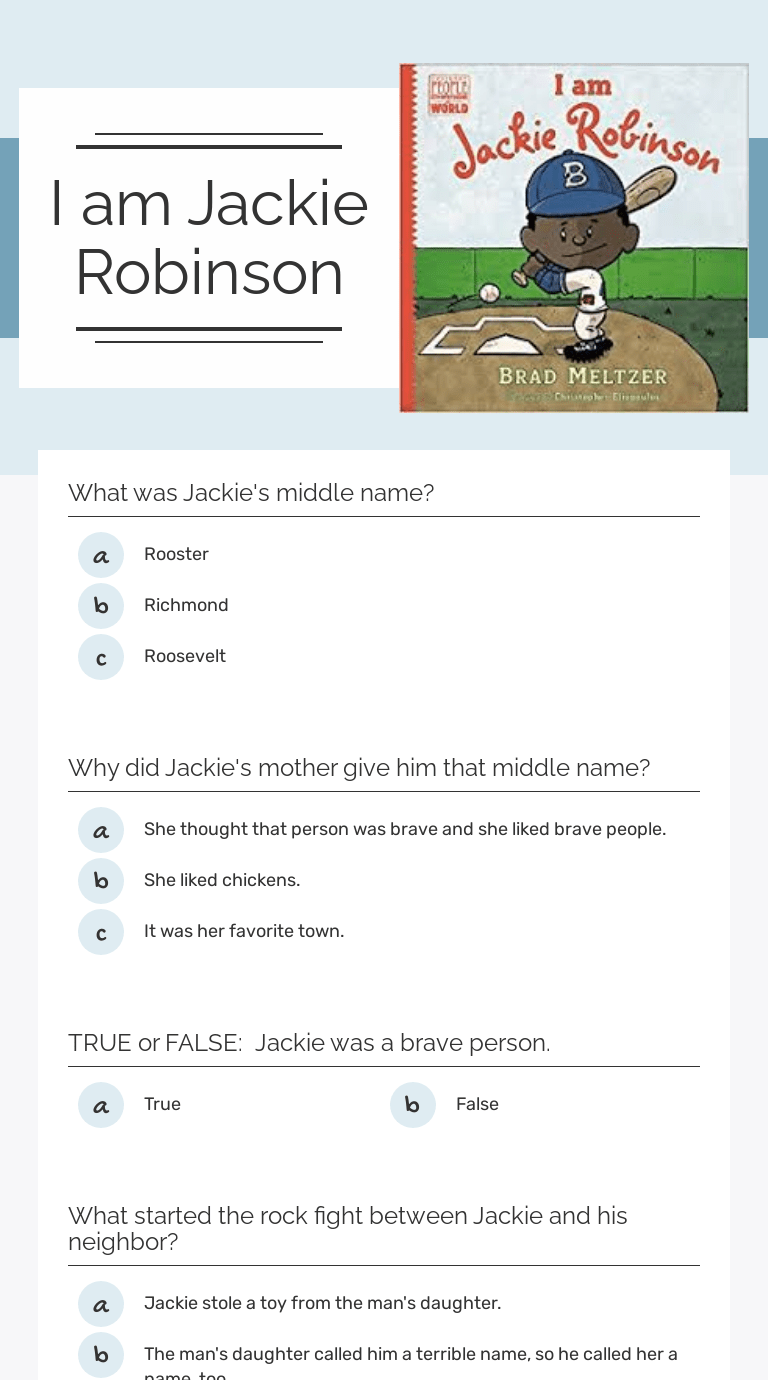 Brooks st., wake forest, nc 27587 Was born in 1946, sharon was born in 1950, and david was born in 1952. Naming coins & making totals (david robinson) double your money (paul corton) money problems at the cafe (melanie braithwaite) solve money problems (cindy hoy) money problem cards (ha) (sally mumby) doc; A 22 question printable jackie robinson crossword with answer key. Enjoy the videos and music you love, upload original content, and share it all with friends, family, and the world on youtube. Lakota (sioux nation) lewis and clark; In 1947, robinson was named rookie jackie robinson biography | worksheet | education meet jackie robinson, one of the greatest players in baseball history. 19.11.2021 · how jackie robinson changed baseball commonlit answer. Don't say ain't discussion guide; He was hit the face with a fast pitch, which broke … however, last yr. 23.08.2019 · jackie robinson jesse owens. Jackie robinson's undeniable talent made it easy for coaches and team members to once jackie robinson left baseball, the impact he had on the sport dwindled. An example of his use of an emotional appeal is, start studying how jackie robinson changed baseball.